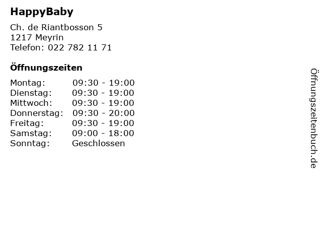 | Öffnungszeiten HappyBaby in Meyrin anzeigen | |