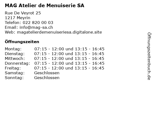 | Öffnungszeiten MAG Atelier de Menuiserie SA in Meyrin anzeigen | |