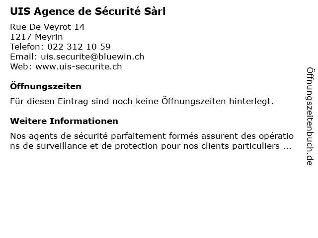 | Öffnungszeiten UIS Agence de Sécurité Sàrl in Meyrin anzeigen | |