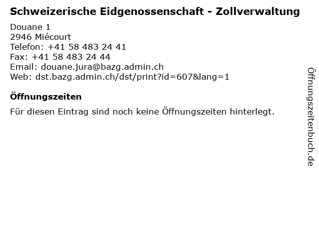 1 Schweizerische Eidgenossenschaft - Zollverwaltung (Entfernung: 5,72 km) Route de la Douane 78b, 2807 Pleigne 2 Schweizerische Eidgenossenschaft - Zollverwaltung (Entfernung: 13,61 km) Plateforme douanière 3, 2926 Boncourt 6 |