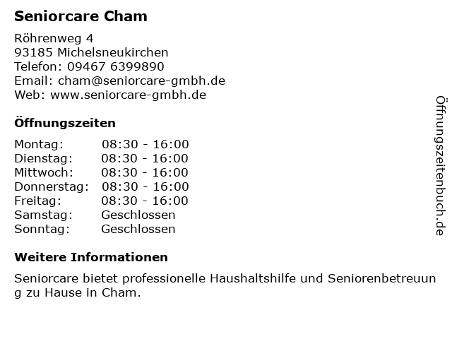 | Öffnungszeiten Seniorcare Cham in Michelsneukirchen anzeigen | |