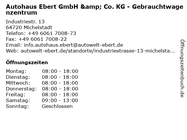 1 Autohaus Ebert GmbH & Co. KG Verkauf, Ersatzteile & Zubehör (Entfernung: 0,11 km) Reinstr. 3, 64720 Michelstadt 2 Autohaus Ebert-Diehm GmbH & Co. KG Autorisierter Mercedes-Benz Verkauf (Entfernung: 0,69 km) Werner-von-Siemens-Str. 102, 64711 Erbach 6 |