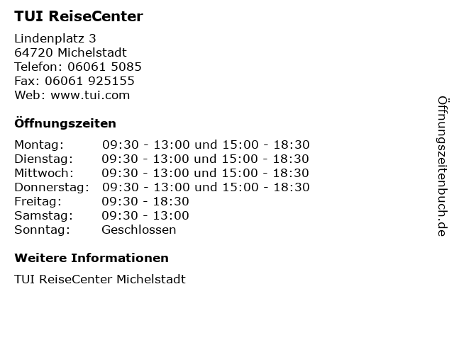 | Öffnungszeiten TUI ReiseCenter in Michelstadt anzeigen | |