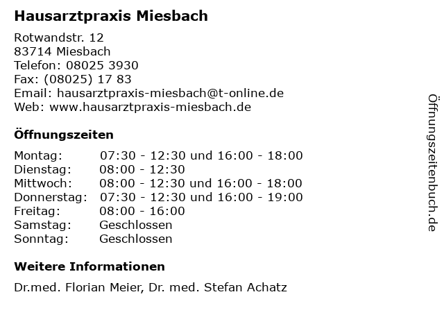| Öffnungszeiten Hausarztpraxis Miesbach in Miesbach anzeigen | |