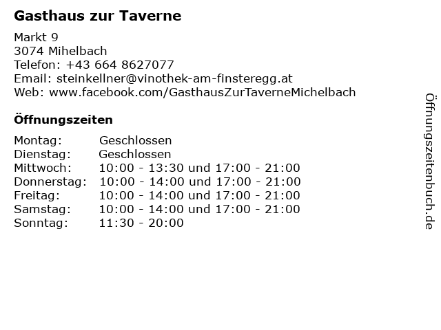 | Öffnungszeiten Gasthaus zur Taverne in Mihelbach anzeigen | |