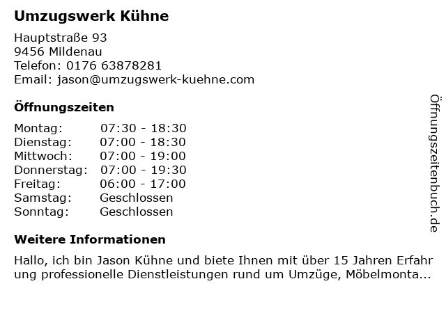 | Öffnungszeiten Umzugswerk Kühne in Mildenau anzeigen | |