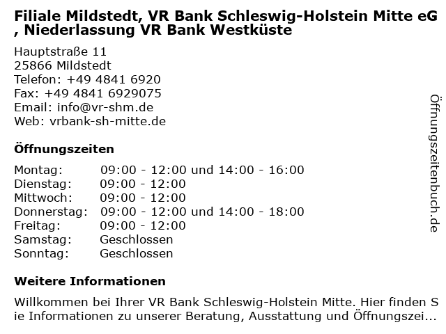 Branchen & Suchbegriffe zu Filiale Mildstedt, VR Bank Schleswig-Holstein Mitte eG, Niederlassung VR Bank Westküste:bank, eg, holstein, mildstedt, mitte, niederlassung, vr, westküste |