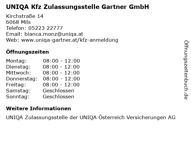 1 UNIQA GeneralAgentur - Gartner & Köck OG Zulassungsstelle (Entfernung: 0,00 km) Kirchstraße 14, 6068 Mils 5 UNIQA Versicherungen AG - Berater Dominic BODE (KFZ Zulassung) (Entfernung: 8,68 km) Amraser Seestraße 14, 6020 Innsbruck 6 UNIQA Versicherungen AG - Berater Dominic BODE (Kontakt & Service) (Entfernung: 8,68 km) Amraser Seestraße 14, 6020 Innsbruck |