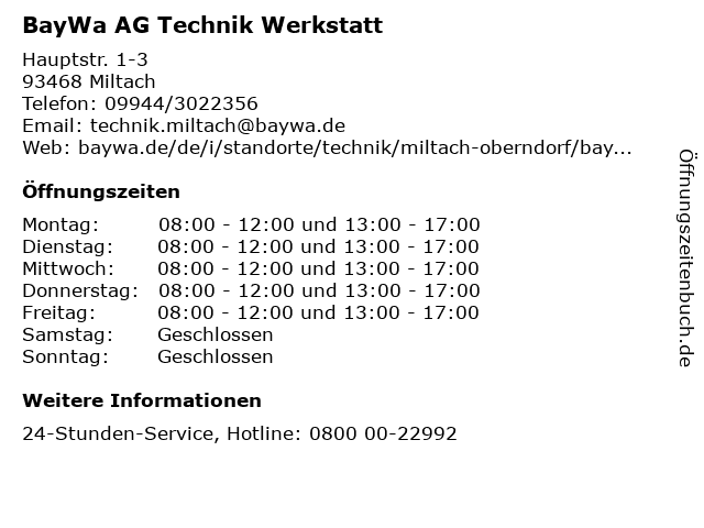 | Öffnungszeiten BayWa AG Technik Werkstatt in Miltach anzeigen | |