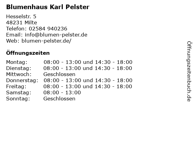 | Öffnungszeiten Blumenhaus Karl Pelster in Milte anzeigen | |