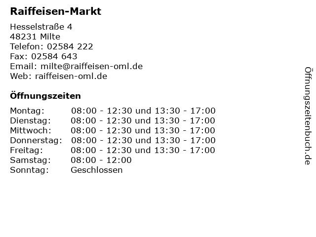 | Öffnungszeiten Raiffeisen-Markt in Milte anzeigen | |