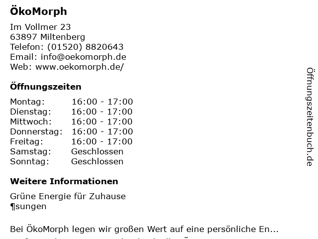 | Öffnungszeiten ÖkoMorph in Miltenberg anzeigen | |