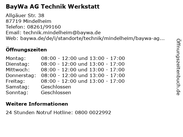 | Öffnungszeiten BayWa AG Technik Werkstatt in Mindelheim anzeigen | |