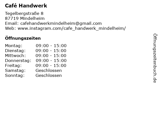 | Öffnungszeiten Café Handwerk in Mindelheim anzeigen | |