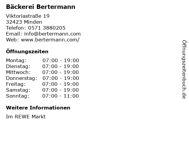 | Öffnungszeiten Bäckerei Bertermann in Minden anzeigen | |