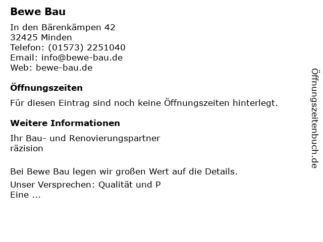 | Öffnungszeiten Bewe Bau in Minden anzeigen | |