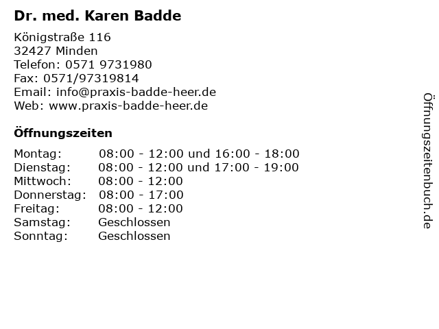 | Öffnungszeiten Dr. med. Karen Badde in Minden anzeigen | |