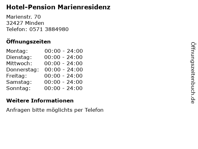 | Öffnungszeiten Hotel-Pension Marienresidenz in Minden anzeigen | |