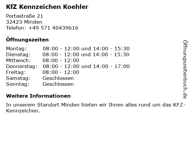 | Öffnungszeiten KfZ Kennzeichen Koehler in Minden anzeigen | |