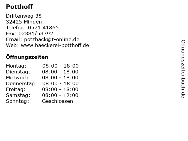 | Öffnungszeiten Potthoff in Minden anzeigen | |