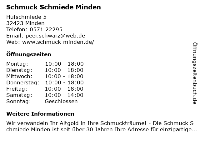 | Öffnungszeiten Schmuck Schmiede Minden in Minden anzeigen | |