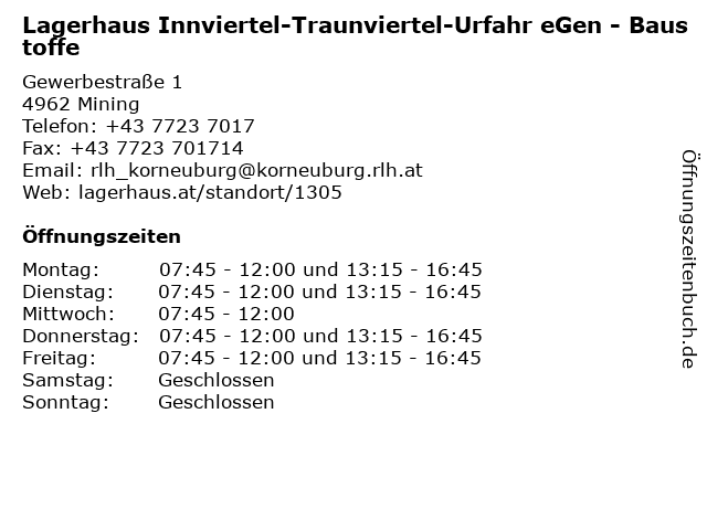1 Lagerhaus Innviertel-Traunviertel-Urfahr eGen - Baustoffe (Entfernung: 6,76 km) Moosham 35, 4943 Geinberg 2 Lagerhaus Innviertel-Traunviertel-Urfahr eGen - Baustoffe (Entfernung: 18,41 km) Harlochnerstraße 1, 5230 Mattighofen 3 Lagerhaus Innviertel-Traunviertel-Urfahr eGen - Genol Tankstelle (Entfernung: 0,05 km) Gewerbestraße 1, 4962 Mining 4 Lagerhaus Innviertel-Traunviertel-Urfahr eGen (Entfernung: 8,70 km) Industriezeile 33, 5280 Braunau am Inn 5 Lagerhaus Innviertel-Traunviertel-Urfahr eGen (Entfernung: 13,85 km) Höhnharterstraße 47, 5252 Aspach 6 Lagerhaus Innviertel-Traunviertel-Urfahr eGen (Entfernung: 18,01 km) Ranshofnerstraße 16, 5134 Schwand |