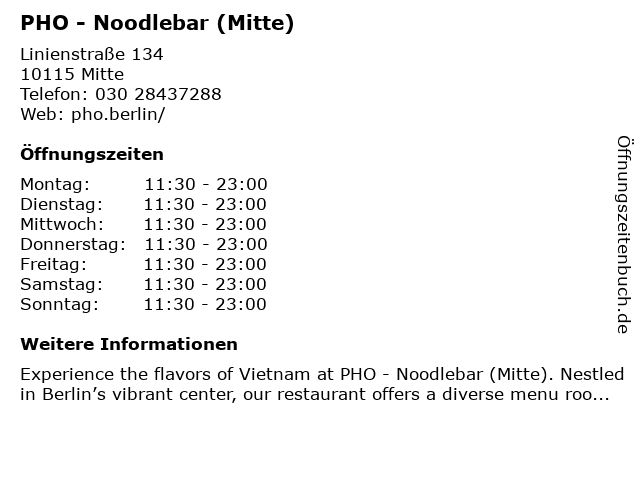 | Öffnungszeiten PHO - Noodlebar (Mitte) in Mitte anzeigen | |