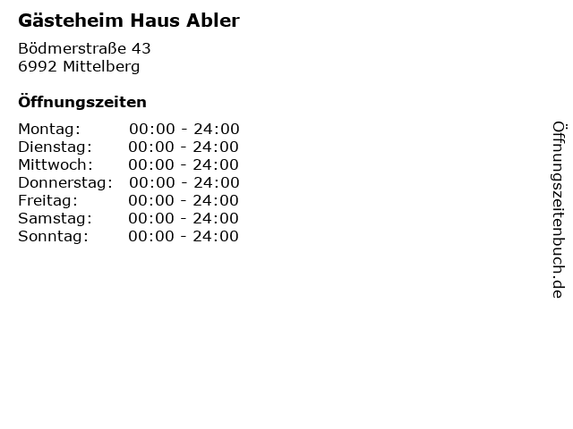 | Öffnungszeiten Gästeheim Haus Abler in Mittelberg anzeigen | |