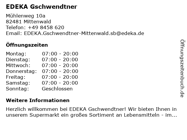 | Öffnungszeiten EDEKA Gschwendtner in Mittenwald anzeigen | |