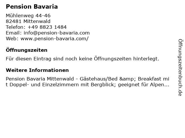 | Öffnungszeiten Pension Bavaria in Mittenwald anzeigen | |
