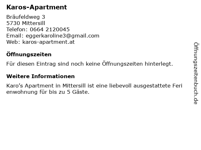 | Öffnungszeiten Karos-Apartment in Mittersill anzeigen | |