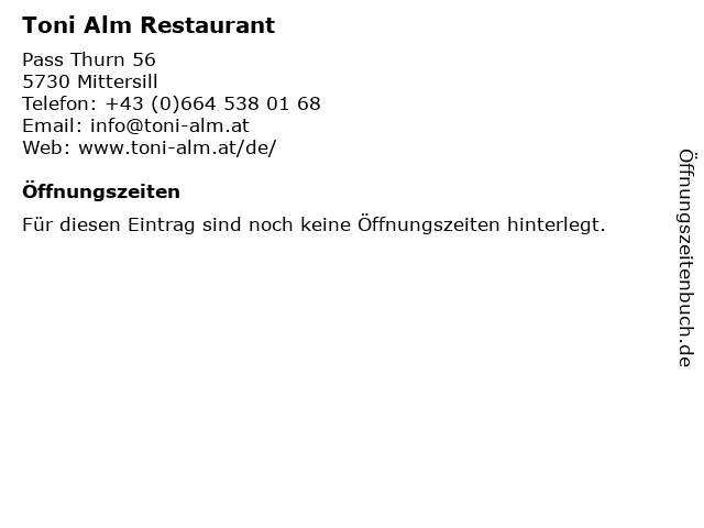 | Öffnungszeiten Toni Alm Restaurant in Mittersill anzeigen | |