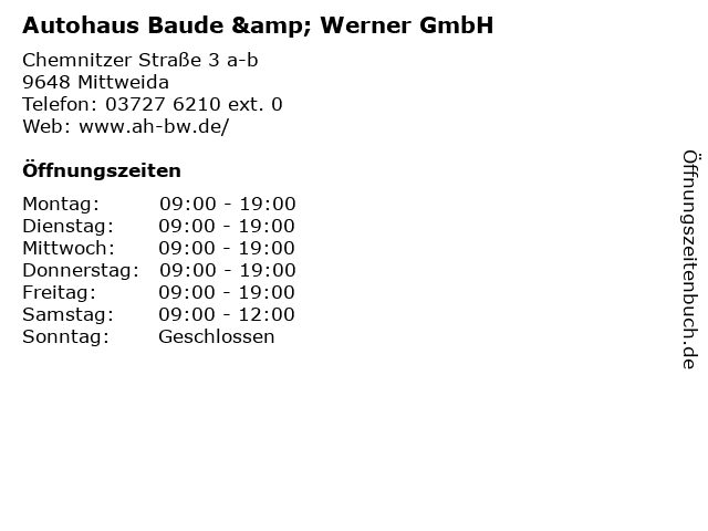 1 Autohaus Baude & Werner Mittweida GmbH - Service (Entfernung: 0,87 km) Chemnitzer Str. 32 a-b, 09633 09648 Mittweida 2 Autohaus Baude & Werner Mittweida GmbH - Verkauf (Entfernung: 0,95 km) Chemnitzer Str. 32a-b, 09648 Mittweida 6 |