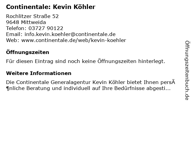 | Öffnungszeiten Continentale: Kevin Köhler in Mittweida anzeigen | |