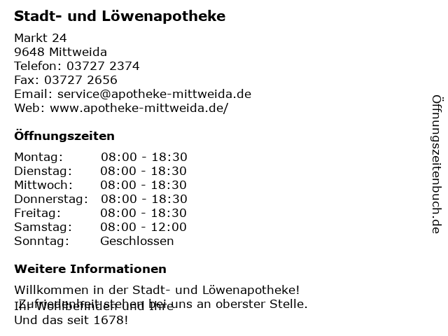 | Öffnungszeiten Stadt- und Löwenapotheke in Mittweida anzeigen | |