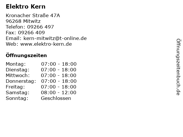 | Öffnungszeiten Elektro Kern in Mitwitz anzeigen | |