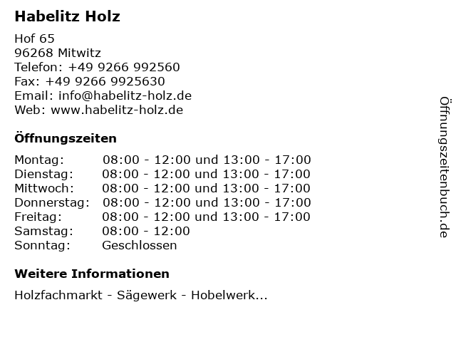 | Öffnungszeiten Habelitz Holz in Mitwitz anzeigen | |