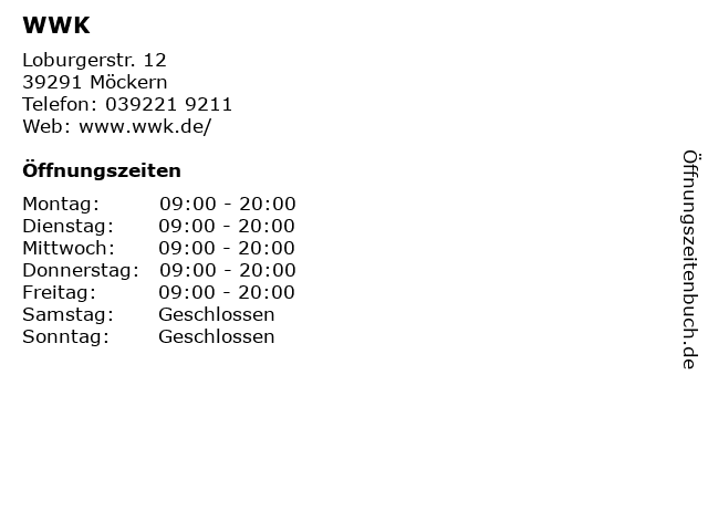 | Öffnungszeiten WWK in Möckern anzeigen | |