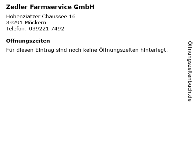 | Öffnungszeiten Zedler Farmservice GmbH in Möckern anzeigen | |