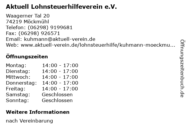 4 Lohnsteuerberatungsverbund e.V. - Lohnsteuerhilfeverein - Beratungsstellenleiter Alexander Sawadski (Entfernung: 1,07 km) Hahnenäcker 37, 74219 Möckmühl 5 Lohnsteuerhilfe Aktuell e.V. Leiterin Elena Kuhmann (Entfernung: 1,20 km) Jagsthäuser Str. 14, 74219 Möckmühl 6 Lohnsteuerberatungsverbund e.V. - Lohnsteuerhilfeverein - Beratungsstellenleiterin Diana Godyniak (Entfernung: 11,23 km) Sonnenbergstraße 23, 74177 Bad Friedrichshall |
