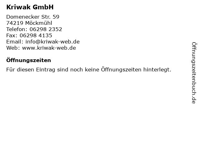 | Öffnungszeiten Kriwak GmbH in Möckmühl anzeigen | |