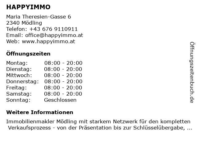 | Öffnungszeiten HAPPYIMMO in Mödling anzeigen | |