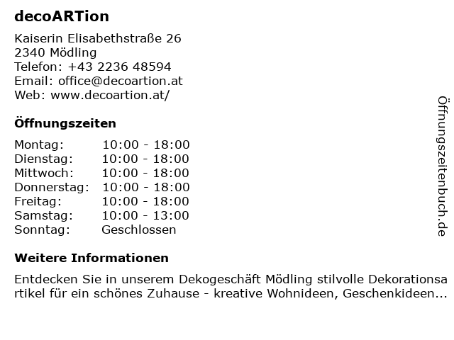 | Öffnungszeiten decoARTion in Mödling anzeigen | |
