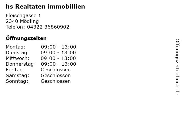 | Öffnungszeiten hs Realtaten immobillien in Mödling anzeigen | |