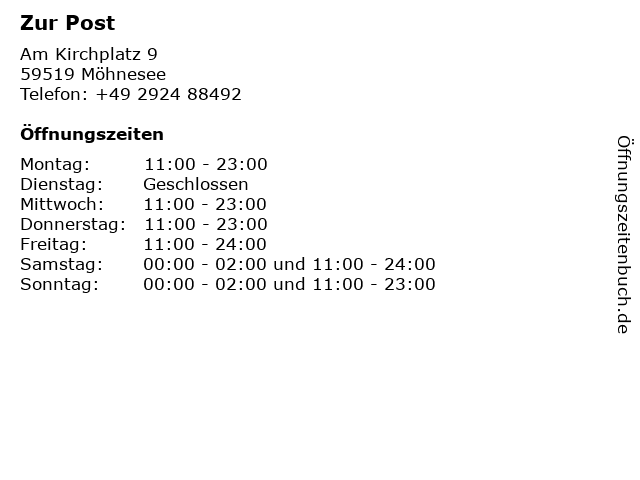 | Öffnungszeiten Zur Post in Möhnesee anzeigen | |