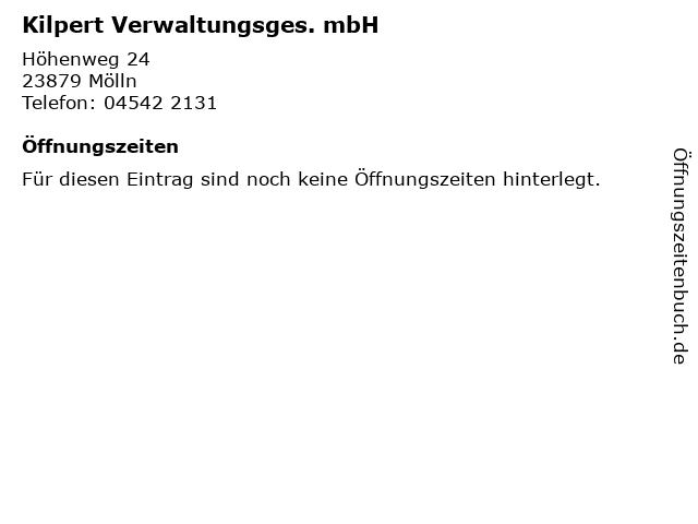 | Öffnungszeiten Kilpert Verwaltungsges. mbH in Mölln anzeigen | |