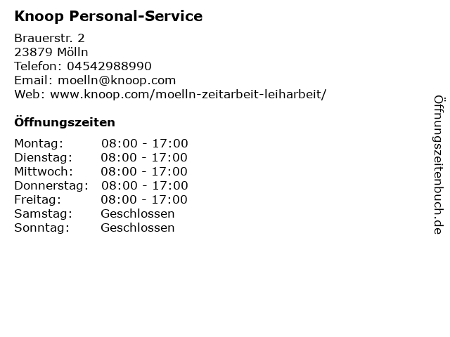 | Öffnungszeiten Knoop Personal-Service in Mölln anzeigen | |