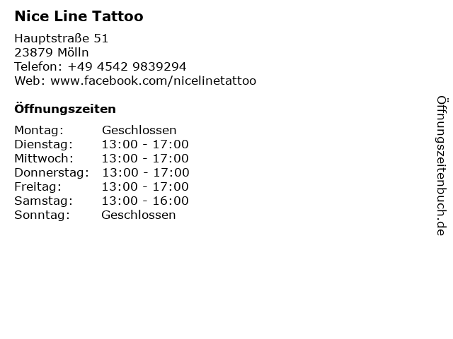 | Öffnungszeiten Nice Line Tattoo in Mölln anzeigen | |