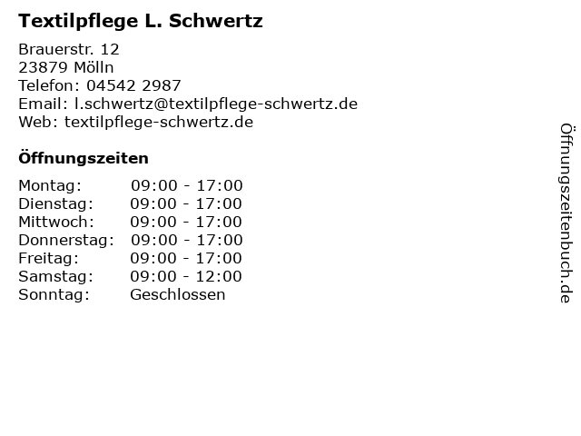 | Öffnungszeiten Textilpflege L. Schwertz in Mölln anzeigen | |