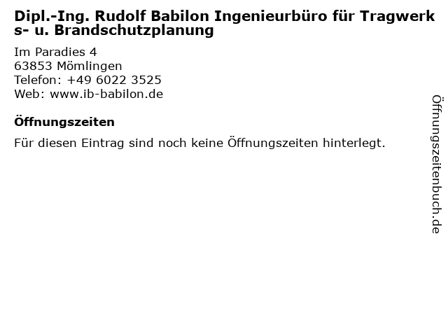 | Dipl.-Ing. Rudolf Babilon Ingenieurbüro für Tragwerks- u. Brandschutzplanung anrufen | |